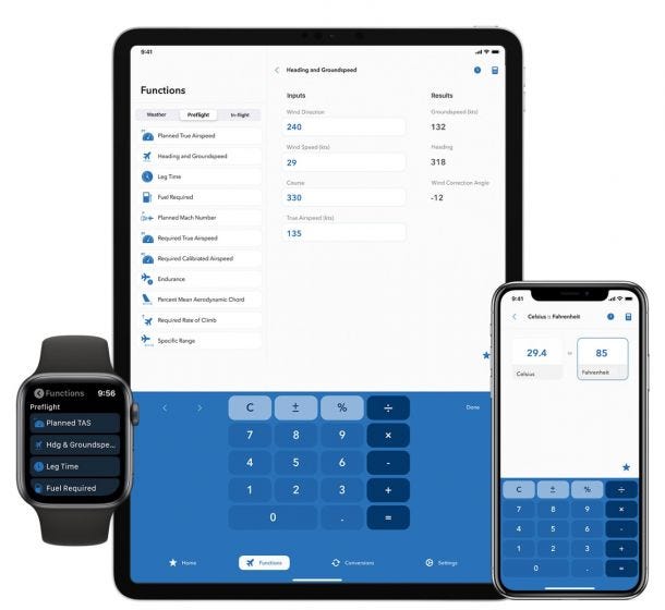 Eine besonders bekannte ist Sporty’s E6B iPhone App, die erst kürzlich ein Update erfahren hat. Die App läuft nun nicht nur auf dem iPhone und dem iPad, sondern auch auf der Apple Watch, was für schnelle Überschlagsrechnungen sehr geschickt ist. Der Preis für die App sind 9,99$